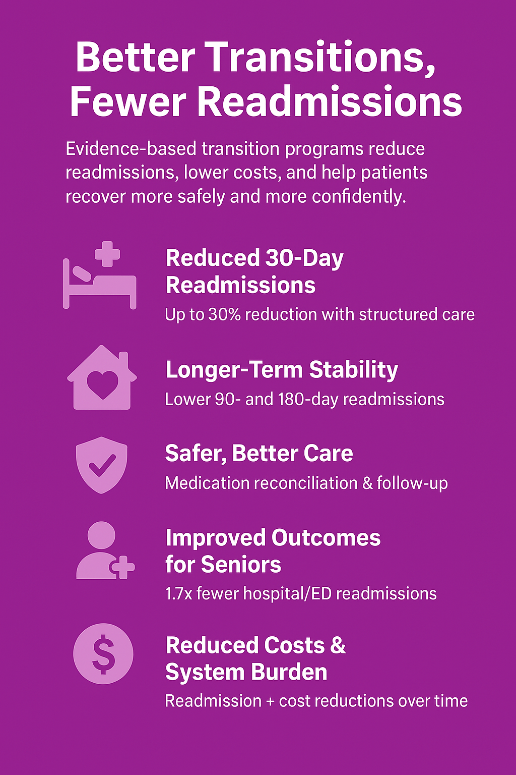 - JAMA Internal Medicine (2016) Transitional care interventions and structured discharge programs have been associated with significant reductions in 30-day hospital readmissions. JAMA Intern Med. 016;174(7):1035–1107.