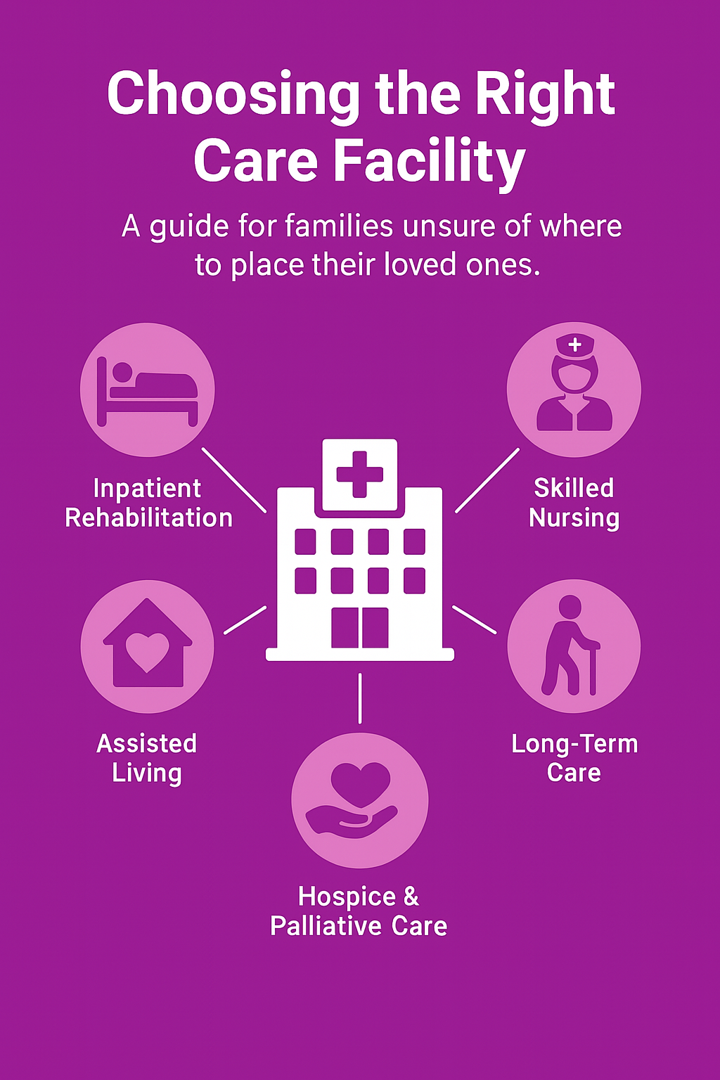 This page provides an easy-to-understand overview of the different types of care available for patients at every stage of their health journey. From hospital and rehabilitation services to skilled nursing, long-term care, assisted living, and hospice or palliative support, each section explains what patients and families can expect and how care is tailored to meet individual needs. It’s designed to help families make informed decisions and feel confident in the care options available.